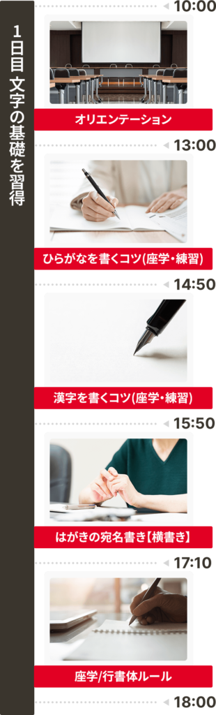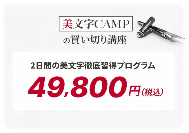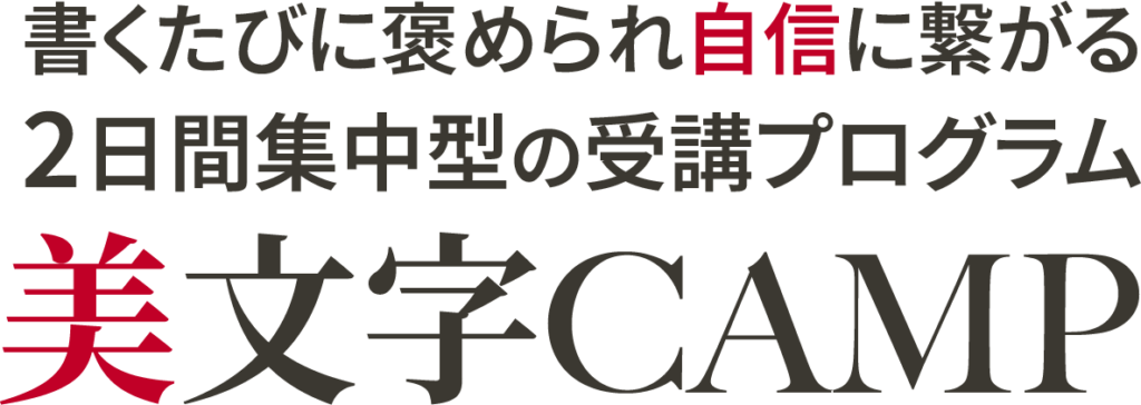 人前で堂々 文字が書けるようになりたい! 冠婚葬祭 重要な場面に負けない自信がほしい! 一時的な上達ではなく 本質的なスキルを身につけたい! 短期集中で徹底的に美文字を習得!オフラインたった2日で学べるプログラム 美文字CAMP独自のメソッドで、ペンの持ち方から文字のバランスまで徹底指導。効率的な学習で、驚くほどの変化を実感できます。オフラインだからこそ、直接指導で疑問も即解決。集中して美文字を習得したいあなたに、最適なプログラムです。 短期集中で徹底的に美文字を習得!オフラインたった2日で学べるプログラム 美文字CAMP独自のメソッドで、ペンの持ち方から文字のバランスまで徹底指導。効率的な学習で、驚くほどの変化を実感できます。オフラインだからこそ、直接指導で疑問も即解決。集中して美文字を習得したいあなたに、最適なプログラムです。 文部科学省後援硬筆・ 毛筆書写技能検定1級合格者が監修! 確かな実力と知識を持つプロが、あなたの美文字を徹底サポートします。長年の経験に基づいた指導で、着実に美文字を習得できます。検定1級合格者が監修するからこそ、効果的な学習が期待できます。安心して、私たちにお任せください。 文部科学省後援硬筆・ 毛筆書写技能検定1級合格者が監修! 確かな実力と知識を持つプロが、あなたの美文字を徹底サポートします。長年の経験に基づいた指導で、着実に美文字を習得できます。検定1級合格者が監修するからこそ、効果的な学習が期待できます。安心して、私たちにお任せください。 字がリバウンドしない! 本質的な練習方法で文字の変化を実感! 美文字CAMPでは、「なぞり書き」や「ひたすら反復練習」といった一時的な上達にとどまる方法は採用しません。独自の練習法で、文字の本質を理解しながら習得するため、効率よく短時間でリバウンドしない美文字を習得できます。 字がリバウンドしない! 本質的な練習方法で文字の変化を実感! 美文字CAMPでは、「なぞり書き」や「ひたすら反復練習」といった一時的な上達にとどまる方法は採用しません。独自の練習法で、文字の本質を理解しながら習得するため、効率よく短時間でリバウンドしない美文字を習得できます。 週末受講OK! たった2日で受講完了できる サンプルテキスト。サンプルテキスト。サンプルテキスト。サンプルテキスト。サンプルテキスト。 字がリバウンドしない! 独自の3STEP練習法 サンプルテキスト。サンプルテキスト。サンプルテキスト。サンプルテキスト。サンプルテキスト。 悩みはすぐ解消! いつでも講師に相談可能 サンプルテキスト。サンプルテキスト。サンプルテキスト。サンプルテキスト。サンプルテキスト。 元小学校、高等学校書道教員 がプログラムを監修 サンプルテキスト。サンプルテキスト。サンプルテキスト。サンプルテキスト。サンプルテキスト。 ※上記の内容は抜粋です ※上記の内容は抜粋です 自分の字が美文字になるイメージが湧きません。 問題ありません。美文字を書けるようになるための流れを徹底してお伝えします。 本当に字が下手なのですが改善しますか? 受講いただければ美文字の本質的な理論やノウハウが理解できますので、現状より改善いたします。 短期間学ぶだけでは、結局自分の元の字に戻ってしまうのではないですか? 1日で美文字の基礎から習得でき、且つ、お一人でもリバウンドしない対策を講じるためのフィードバックがあります。 個人差はありますが、講師が直接指導することで限りなくリバウンドしづらいノウハウをご提供します。 はじめまして、美文字CAMPを運営している代表のみやです。あなたは今、自分に自信が持てず、心がモヤモヤしていませんか?実は私も、学生の頃は運動神経も成績も悪く、自分に自信を持つことができませんでした。そんな私の人生が少し変わったのは、小学校3年生の時です。ある日、先生が私の書いた字を褒めてくれたんです。そこから「自分には才能があるんだ」と思い込み、字を書くことが好きになりました。その後、習字を習い始め、先生だけでなく周囲に褒められる機会が増えたことで自己肯定感も上がっていったんです。社会人になってからも、手書きのメッセージや書類を通して、たくさんの方に「字がキレイですね」と言っていただく機会がありました。そして字は、その人の印象や人間性までも表現できる、とても素敵なコミュニケーションツールだと気づいたんです。もしあなたが今、少しでも『字が上手くなりたい、変わりたい』と思っているなら、ぜひ、私たちと一緒にペンを握ってみませんか?当講座では、一人ひとりの気持ちに寄り添い、それぞれのペースに合わせて、丁寧に指導させていただきます。“美文字”は才能ではなく、誰でも身につけられるスキル。あなたの文字が、あなたの自信に、そしてあなたの人生を彩る一部になるように、全力でサポートいたします。