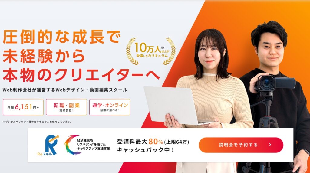 | 補助金制度 利用後の料金(税込) | ・動画編集入門プラン:実質55,200円 ・動画ディレクター専攻:実質140,000円 |