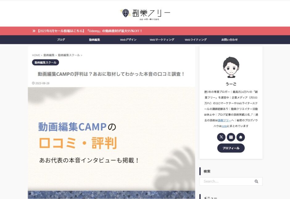 動画編集CAMPコラムTOP 副業サイトで動画編集CAMPが紹介されました! 副業サイトで動画編集CAMPが紹介されました! SHARE ポスト シェア はてブ LINE 副業サイト『副業フリー』で動画編集CAMPが紹介されました!動画編集CAMPの口コミ・評判や、主催のあお(青笹寛史)氏へのインタビューも掲載されています!ぜひチェックしてみてください!『副業フリー』動画編集CAMPの評判は?あおに取材してわかった本音の口コミ調査!