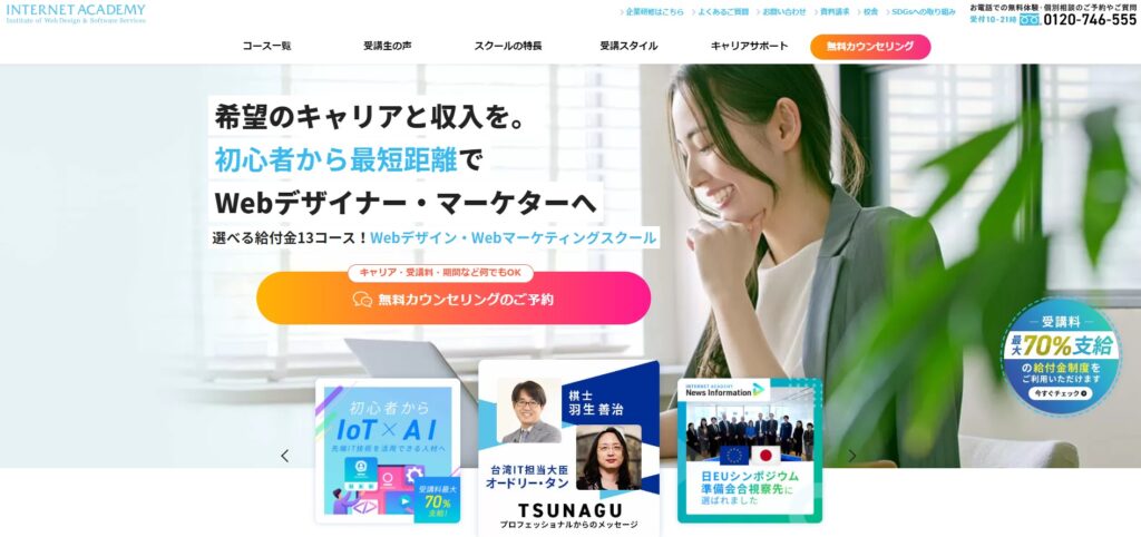 受講費は高いですが、アドビプラチナスクールパートナーになっており、Creative Cloudが特別価格で利用可能です。また、最大70%のキャッシュバックが受けられるため、気になる方はまず無料相談をしてみるのがおすすめです。