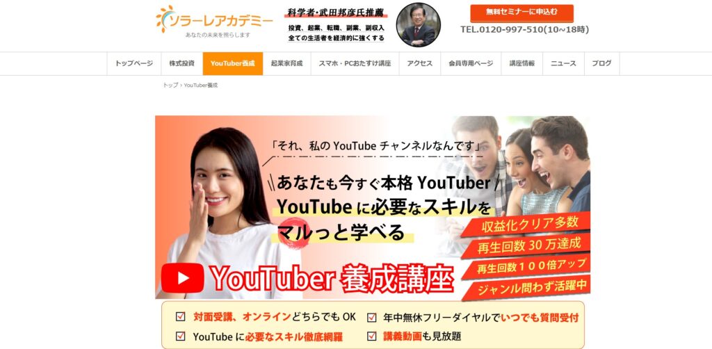 ソラーレアカデミーのYouTuber養成講座は、対面とオンラインが選択可能なスクールです。YouTube動画に必要なスキルはもちろん、再生回数をアップさせるための戦略も学べます。