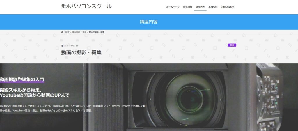 講座内容 | 撮影、編集、YouTubeの開設など |