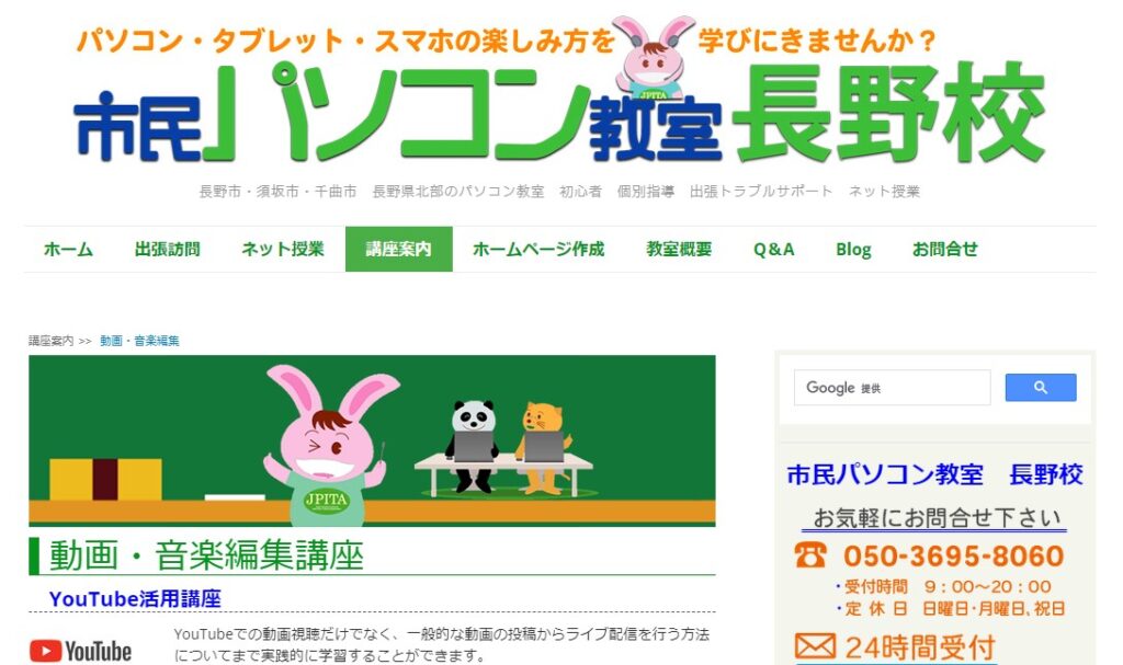 市民パソコン教室 長野校は、パソコン関連のさまざまな授業を行っているスクールです。動画編集に関する講座は「YouTube活用講座」や「Filmora 講座」などがあります。