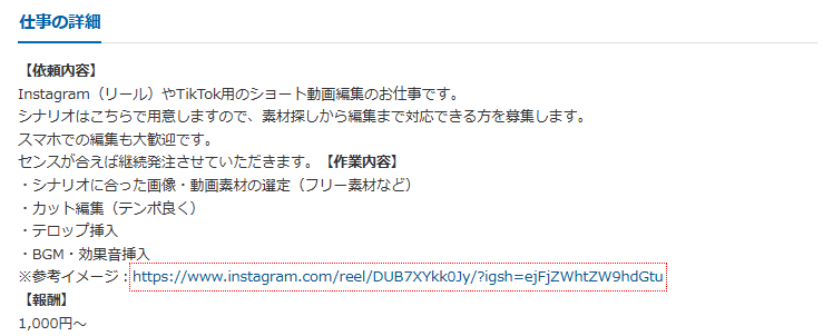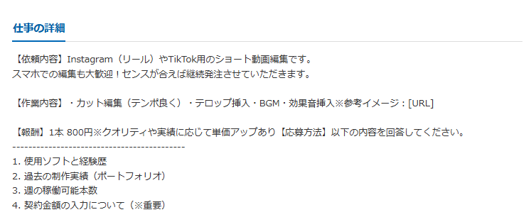 シナリオが提供された状態からスタートするため、「何を作ればいいかわからない」という初心者にとって取り組みやすい案件です。素材選定から編集までを一括で担当するぶん、単価は1,000円からと先の案件より高めに設定されています。継続依頼の可能性もあるため、安定した副業収入を目指す入口としても活用できます。